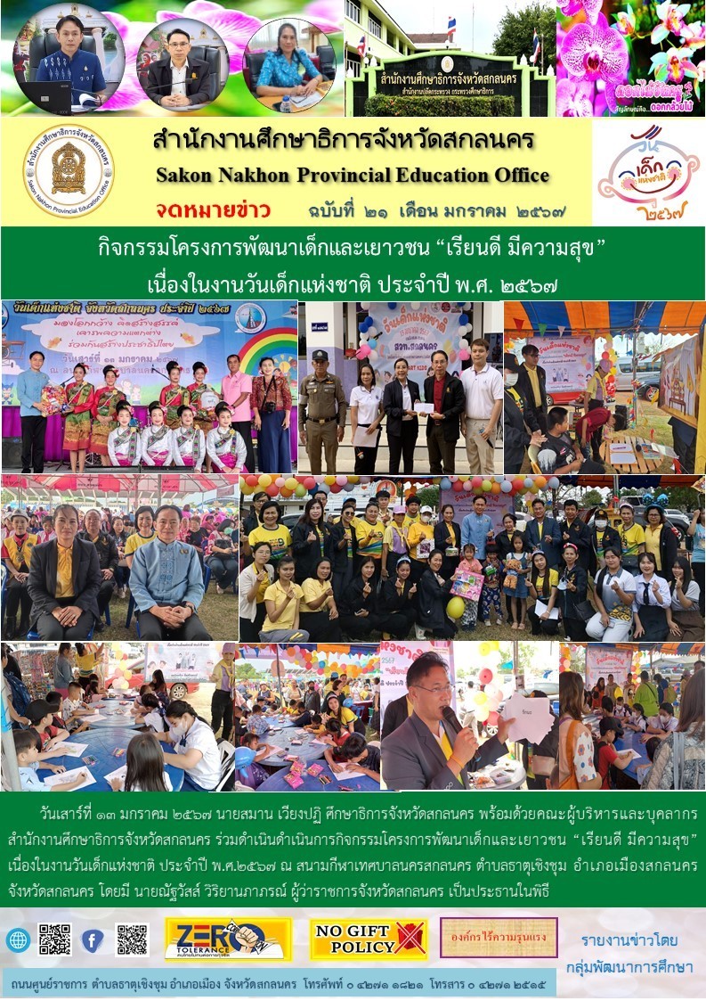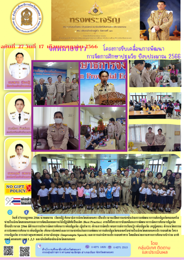 วันที่ 17กรกฎาคม 2566 สำนักงานศึกษาธิการจังหวัดสกลนคร จัดการแข่งขันกิจกรรมพัฒนาการเด็กปฐมวัยของเครือข่ายในจังหวัดสกลนครและการคัดเลือกผลงานวิธีปฏิบัติที่เป็นเลิศ (Best Practice) ภายใต้โครงการขับเคลื่อนการพัฒนาการจัดการศึกษาปฐมวัย ปีงบประมาณ 2566 มีด้านการบริหารจัดการศึกษาระดับปฐมวัย (ผู้บริหาร) ด้านการจัดประสบการณ์การเรียนรู้ระดับปฐมวัย (ครูผู้สอน) ด้านนวัตกรรมการนิเทศการศึกษาระดับปฐมวัย (ศึกษานิเทศก์)และการแข่งขันกิจกรรมพัฒนาการเด็กปฐมวัยของเครือข่ายในจังหวัดสกลนครประกอบด้วย โครงงานปฐมวัย การกล่าวสุนทรพจน์ ภาษาอังกฤษ (Impromptu Speech) และการเล่านิทานประกอบท่าทาง โดยมีหน่วยงานทางการศึกษาเข้าร่วม อาทิ สพป.สกลนคร เขต 1 ,2,3 และสังกัดท้องถิ่นจังหวัดสกลนคร